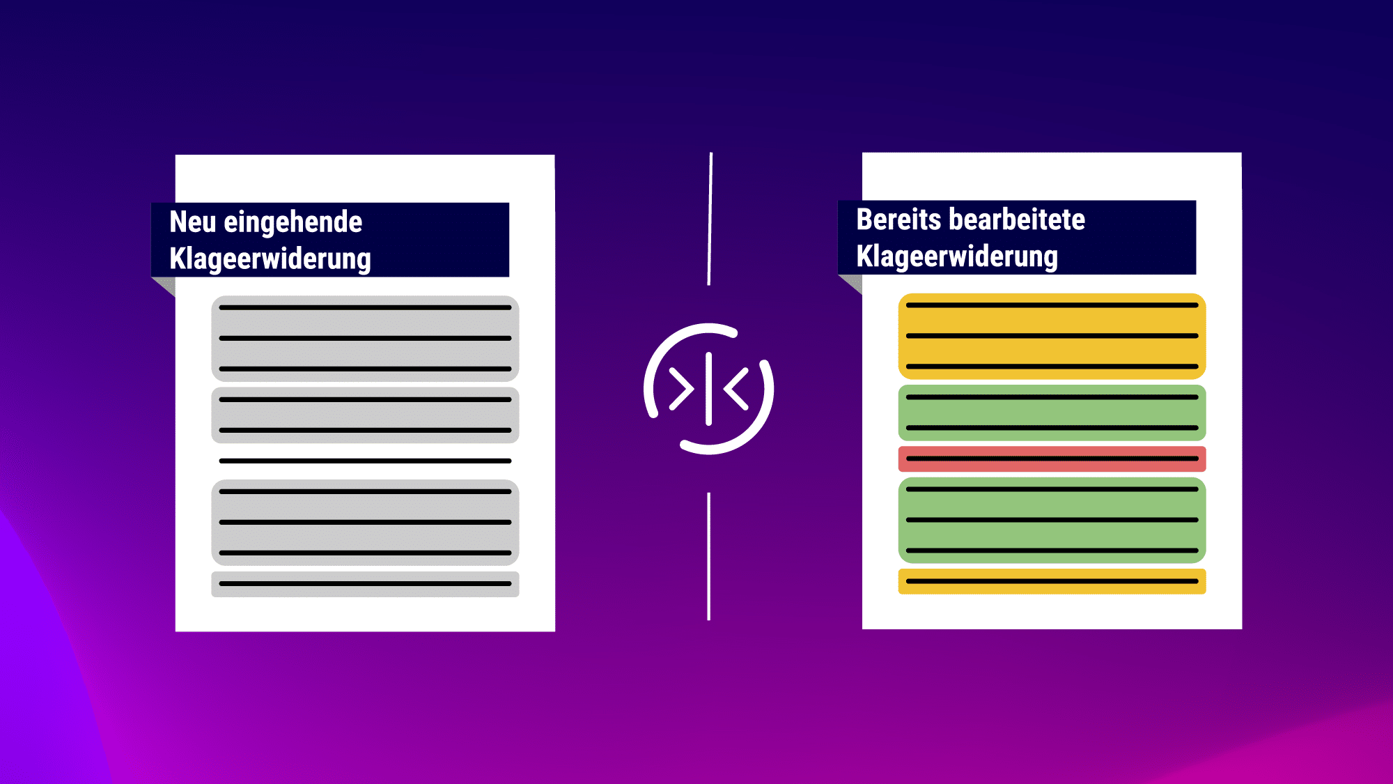 Über unseren Compare, kannst Du bisherige Klageerwiderungen mit neu eingehenden Klageerwiderungen abgleichen. semantha® zeigt Dir an, welche Inhalte übereinstimmen und welche Inhalte fehlen – out of the box und ohne aufwändiges Training mit Euren Daten.