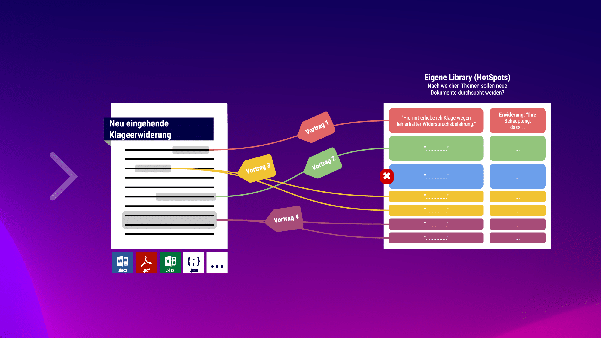 In unserer Library kannst Du Inhalte definieren, auf welche neu eingehende Klageerwiderungen untersucht werden sollen. semantha® findet die Passagen anhand der Bedeutung, unabhängig der Wortwahl. So ist für jeden Vortrag schnell die passende Erwiderung gefunden.