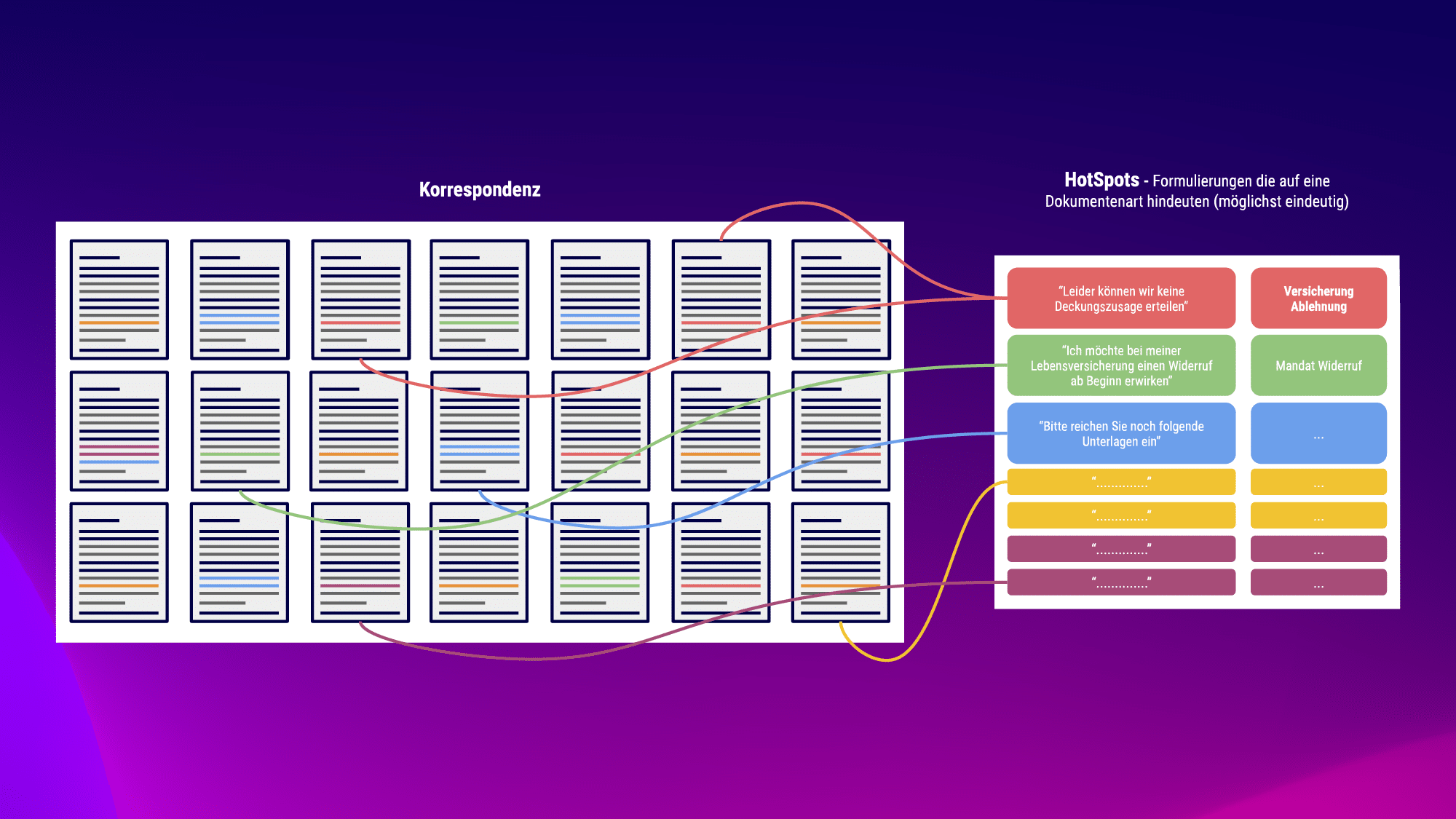 Neben den Schriftsätzen kommt es zu Massen an Korrespondenzen mit den Rechtsschutzversicherung, Unternehmen und Mandanten. Jedes Schreiben muss unter hohem Aufwand analysiert werden, bevor der nächste Schritt eingeleitet werden kann. Dabei ist eine Zuordnung zu bestimmten Kategorien durchaus möglich, aber das Problem: ähnliche Sachverhalte werden ganz unterschiedlich formuliert, was eine Automatisierung von Prozessen unmöglich macht.